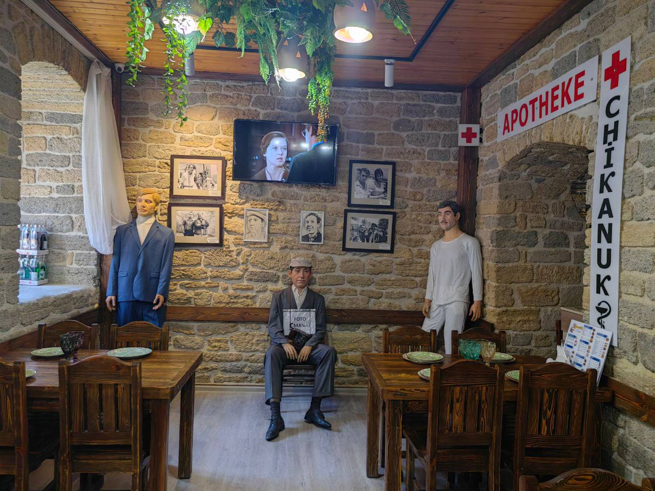 Внутри кафе небольшое, на 11 столов. Помещение полуподвальное, поэтому свет льется из окон немного с высоты, что придает атмосферности. Массивные деревянные столы и стулья. На стенах развешены фотографии со съемок фильма. Тут же возле стен – фигуры незадачливых героев: Кеши, Семен Семеныча, и двух аборигенов с их «непереводимой игрой слов». Знатоки, правда утверждают, что куклы не очень похожи на актеров. Но какая разница по большому счёту, если сюда приходят за вайбом фильма и духом уютного советского прошлого. И получают его сполна!